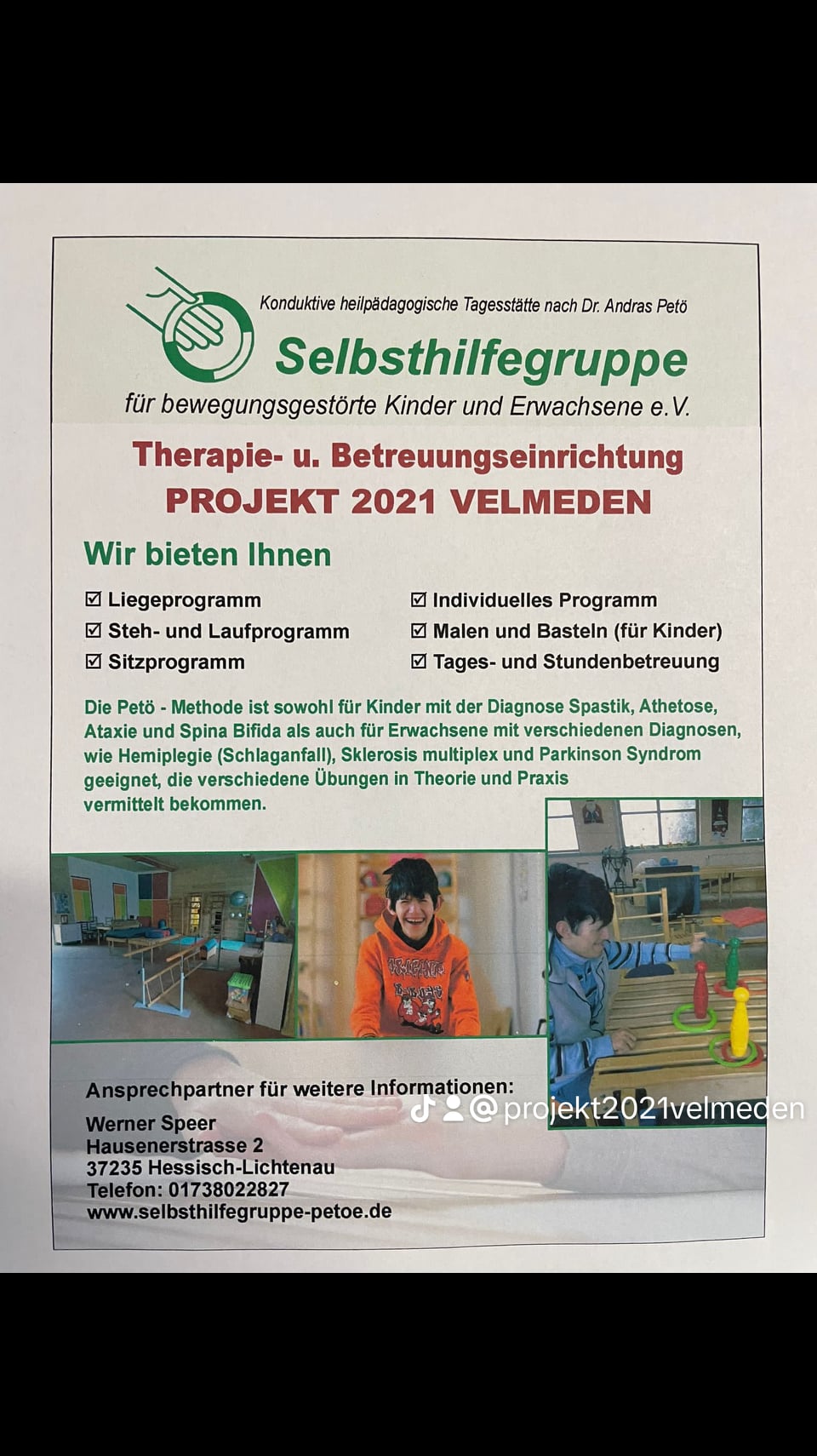 Konduktive Förderung Die Konduktive Förderung wurde von dem ungarischen Neurologen und Pädagogen Dr. András Petö entwickelt. Oberstes Ziel ist es, Kinder mit Cerebralparese so weit zu befähigen, dass sie eine maximale Unabhängigkeit von Hilfsmitteln und Personen erreichen.Die Konduktive Förderung ist ein ganzheitliches Fördersystem, das vom kleinen Kind bis zum Erwachsenen angewendet werden kann. Im Mittelpunkt steht dabei der Mensch und nicht die Behinderung.András Petö sieht in der Cerebralparese nicht nur eine motorische Beeinträchtigung, sondern eine Lernstörung, die die ganze Person betrifft.Daher sagte er:„Lasst doch die gelähmten Muskeln, beschäftigt euch mit der gesamten Persönlichkeit!“In der 4jährigen Fachhochschulausbildung der Konduktoren/innen werden Elemente der Krankengymnastik, Ergotherapie und Logopädie mit psychologischen, heil- und sonderpädagogischen Elementen zusammengeführt (konduktiv = zusammen-führend). Die Konduktorin ist für die körperlichen, seelischen und geistigen Bedürfnisse des Kindes verantwortlich. Die Herausforderung besteht darin, die trotz Behinderung vorhandenen Ressourcen zur Alltagsbewältigung zu nutzen. So entstehen durch einen aktiven Lernprozess neue Bahnungen im Nervensystem.„Zeige mir, wie ich es mit meinen Möglichkeiten schaffen kann!“Die Förderung findet in der Gruppe statt und nutzt so gruppendynamische Momente zur Anregung, Motivationssteigerung, zum Nacheifern und Nachahmen.Auch der gemeinsame Spaß und spielerische Elemente kommen nicht zu kurz. Hilfsmittel werden so viel wie nötig, aber so wenig wie möglich verwendet. Alle therapeutischen Programme werden mit der Stimme durch rhythmische Wortfolgen oder Lieder und Reime begleitet. Die Programme finden in gleichbleibenden Abläufen statt, die das Lernen erleichtern, Sicherheit geben, aber auch das Gedächtnis schulen und dem Kind ermöglichen, Fortschritte selbst zu erkennen.Die motorischen Programme bestehen aus Dehn- und Streck-Übungen im Liegen (auf Pritschen oder Matten), individuellen Steh- und Laufübungen (mit verschiedenen Hilfsmitteln) sowie funktionell orientierte Arm- und feinmotorische Handprogramme. Zusätzlich gibt es z.B. Gleichgewichts- und Atemübungen.Ziele der Konduktiven FörderungERWERB MOTORISCHER GRUNDFERTIGKEITEN…z.B. Greifen, Robben, Krabbeln Sitzen, Stehen, Laufen.ERREICHEN GRÖSSTMÖGLICHER SELBSTSTÄNDIGKEIT IM ALLTÄGLICHEN HANDELN…z. B. Essen, An- und Ausziehen, Sauberkeit.FÖRDERUNG DER WAHRNEHMUNGFörderung der Kognitiven Fähigkeiten und der Konzentration.ERWEITERUNG DER KOMMUNIKATIVEN UND SOZIALEN FÄHIGKEITEN…z.B. Sprache, Gruppenfähigkeit, Kooperation, Regellernen, Empathie.GRÖSSTMÖGLICHE EIGENAKTIVITÄT…und damit Stärkung des Selbstbewusstseins und der gesamten Persönlichkeit.BEGLEITENDE BERATUNG…und Anleitung der Eltern.BEI ERWACHSENEN STEHEN MEISTENS DIE SCHULUNG DES GLEICHGEWICHTS, DER BEWEGLICHKEIT IN DER GROB- UND FEINMOTORIK UND DIE REDUZIERUNG DER SPASTIZITÄT IM MITTELPUNKT.Hiermit wird v.a. die Selbstständigkeit und das Alltagshandeln unterstützt.ZielgruppeDie Petö-Methode ist für Kinder und Erwachsene mit einer Hirn- oder Nervenschädigung geeignet (Cerebralparese, Spastik, Athetose, Ataxie, Hypotonie, Spina bifida, Zustand nach Unfällen oder Schlaganfall, bei MS oder Parkinson).Ihr ganzheitlicher Ansatz, der in jedem Kind Lern- und Entwicklungspotential sieht und es zielorientiert, nicht defizitgeleitet fördert, ist für viele Kinder mit unterschiedlichen Behinderungen geeignet.Die Förderung kann schon mit sehr kleinen Kindern ab circa einem Jahr begonnen werden und findet im frühen Alter meist als Eltern-Kind-Gruppe statt, die v.a. der Anleitung der Eltern dient. Ab dem Kindergartenalter können die meisten Kinder in Gruppen gefördert werden. Hierzu müssen sie gruppenfähig sein und einfache Aufforderungen verstehen können. Es ist nicht notwendig, dass sie über eine aktive Sprache verfügen.